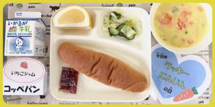 今日の献立は、コーンクリームシチュー・キャベツときゅうりのサラダ・かわちばんかん・コッペパン・いちごジャム・牛乳でした。