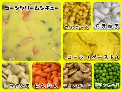 コーンクリームシチューは、鶏肉を主材に、粒のコーンと流水解凍したペースト状のコーンを使ったシチューです。コーンペーストは、今年度より使用されている新食材です。