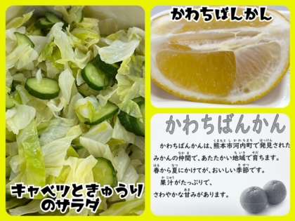 サラダは、焼き物機で蒸したキャベツときゅうりに砂糖・塩・ワインビネガー・綿実油で作ったドレッシングをかけ、あえています。