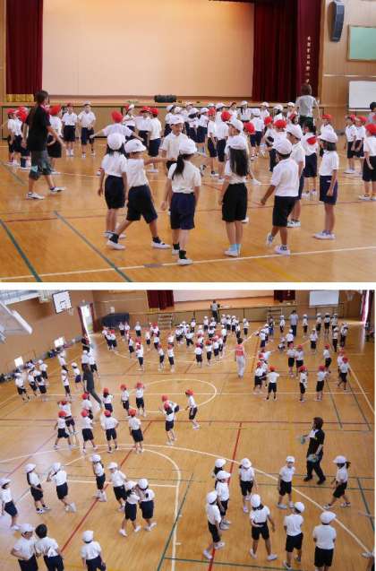 1・2年生が体育館でダンスの練習です。輪になってがんばってますね。2曲あるからね。おぼえることができているかな。