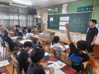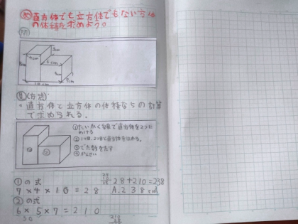 算数科の時間は、直方体でも立方体でもない立体の体積の求め方をみんなで考えました。