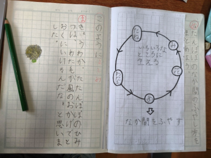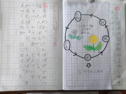 今日は、「たんぽぽの仲間の増やし方」について本文から読み取り、ノートにまとめました。
