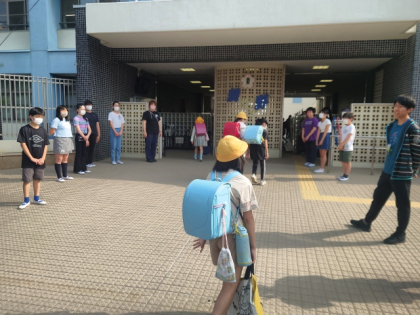高学年の運営委員の子どもたちが正門であいさつ運動をしています。