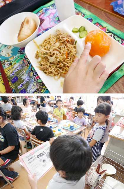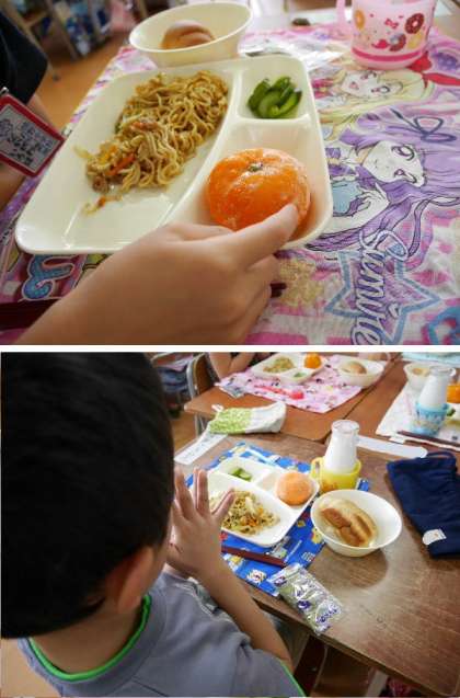今日の給食は、焼きそば、あっさりきゅうり、冷凍みかんでした。冷凍みかんは子どもたちに人気ですね。カチコチに凍っています。冷たくておいしいね。