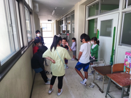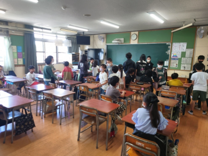 まず、各教室でたてわり班ごとに集合して自己紹介をしたり、集会の並び方を練習したりしています。