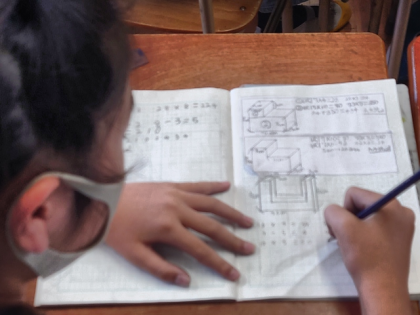 算数科の時間は、直方体や立方体が組み合わさった形の立体の体積の求め方を考えました。