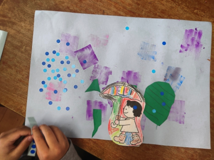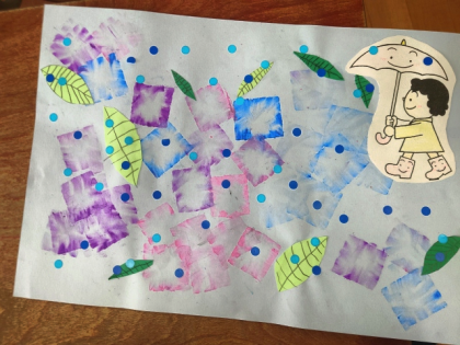 今日は、あじさいの絵に「雨」のシールを貼っています。