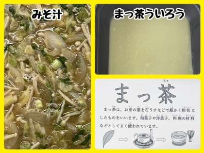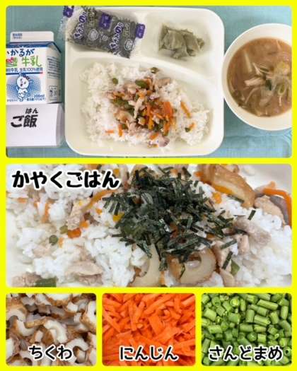 今日の献立は、かやくご飯・みそ汁・まっ茶ういろう・牛乳でした。