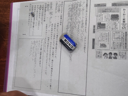 国語科の時間は、教材文を読んで、題名の付け方や、見出し、写真・グラフなどの工夫している点を見つけました。