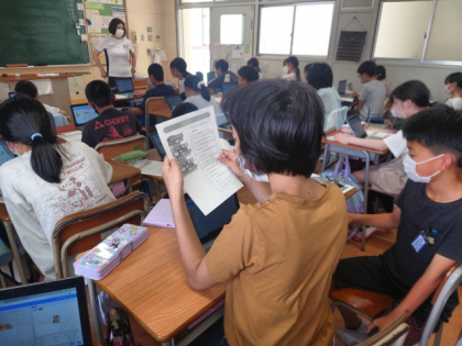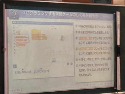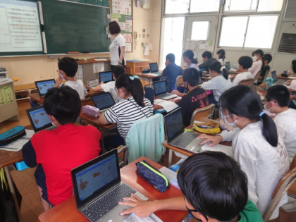 総合的な学習の時間に、プログラミングアプリのスクラッチを使って、「正解すると得点が入るしくみ」をつくっています。