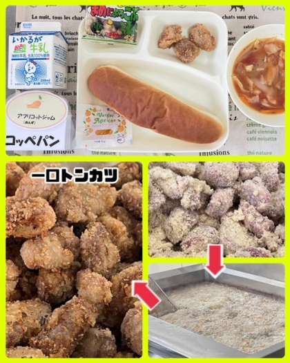 今日の献立は、一ロトンカツ・ミネストローネ・豆こんぶ・コッペパン・アプリコットジャム・牛乳でした。