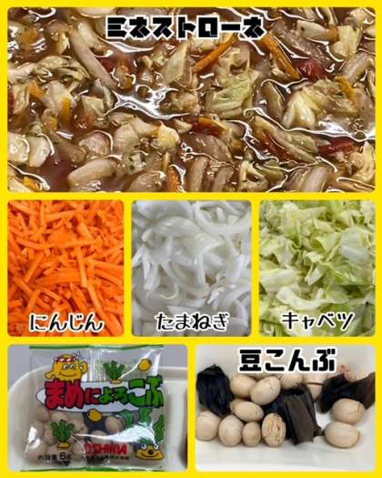 ミネストローネとはイタリア語で「具だくさん」という意味で、たまねぎやにんじん、トマトなどの野菜がたくさん入ったスープのことをいいます。今日の給食では、鶏肉とキャベツ・たまねぎ・トマトなどが使われています。にんにくとオリーブ油で香りよく仕上げています。