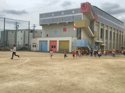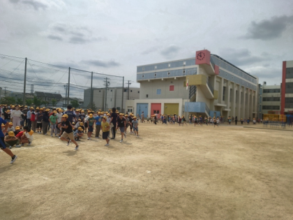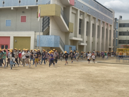 「避難訓練です。大きな地震が発生しました。」の放送の後、子どもたちが各教室で机の下に身をかくし、指示に従って運動場に避難しました。