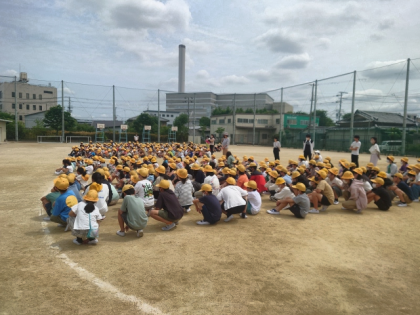 「避難訓練です。大きな地震が発生しました。」の放送の後、子どもたちが各教室で机の下に身をかくし、指示に従って運動場に避難しました。