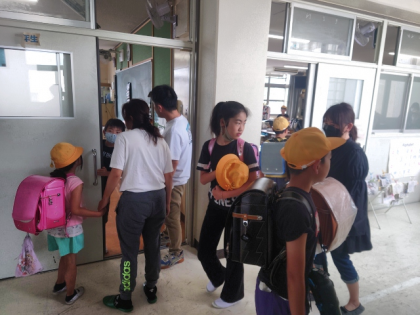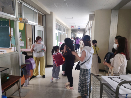 災害が起こった時に、児童を引き渡す保護者のチェックと引き渡しを速やかに行うことができるよう、下校時に「引き渡し訓練」を行いました。