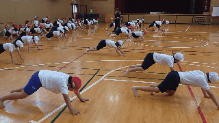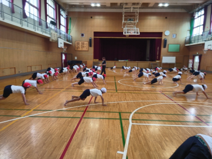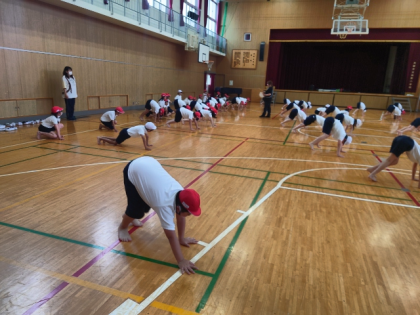 体育科の時間は、太鼓のリズムに合わせて「うさぎジャンプ」「あざらし歩き」など、基礎体力をつける運動に楽しく取組みました。