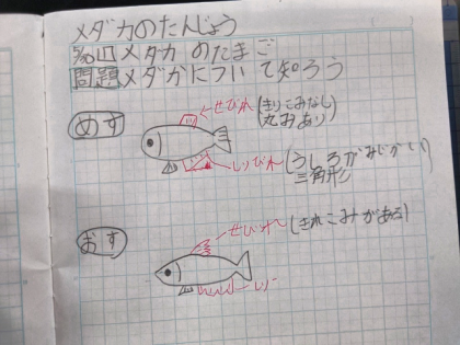 理科の時間は、メダカの体のつくりについて調べ、ノートにまとめました。