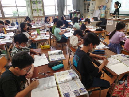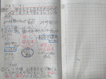 社会科の時間は、安心・安全な水を送るため、だれがどのような工夫や努力をしているのか調べて、ノートにまとめました。