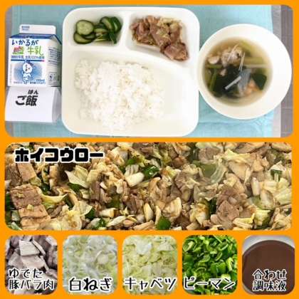 今日の献立は、ホイコウロー・中華スープ・きゅうりのピリ辛あえ・ごはん・牛乳でした。