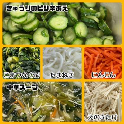 スープは、鶏肉・たまねぎ・にんじん・えのきたけ、青みに冷凍のこまつなを使用し、塩・こしょう・うすくちしょうゆ・中華スープの素で味つけしています。