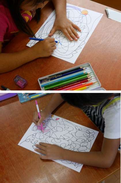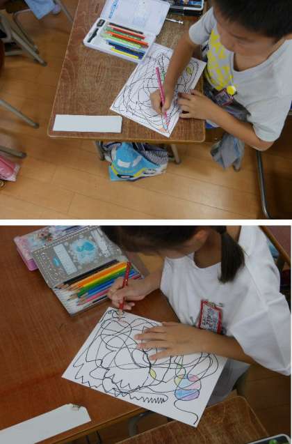 1年生が画用紙に線をひっぱっていました。1本の線で描いていきます。途中で付け足したり、止まらいないでかきつけます。