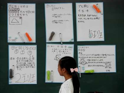 6年算数は図形について学習しています。「形が同じで大きさがちがう図形を調べよう」のところの質問を班で考えて発表していました。いろいろな考えを知って、自分の考え方と比べてみてよく考える勉強をしていきましょう。