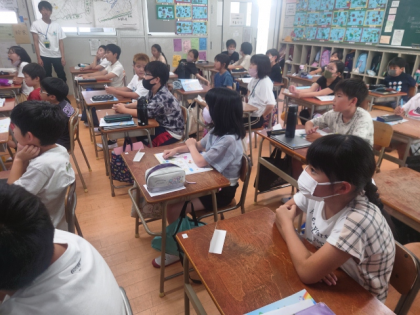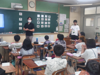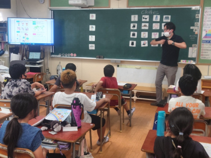 英語活動の時間は、天気や衣類を表す英語の表現を学習し、どんな天気のときに、どんな服装をするのか、英語の文章を聞いて、教科書の絵を線で結びました。