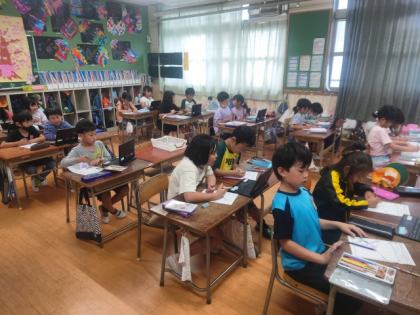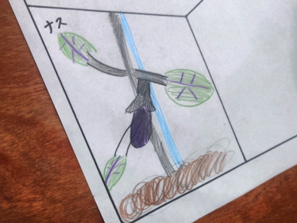 生活科の時間は、自分たちで植えたナス、ピーマン、キュウリを写真で撮って、写真を見ながらカードに絵を描きました。