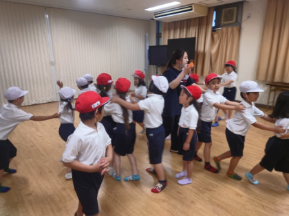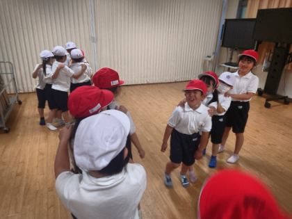 雨のため運動場で体育の学習ができず、今日は多目的室で「じゃんけんれっしゃ」などをして、みんなで体を動かしました。