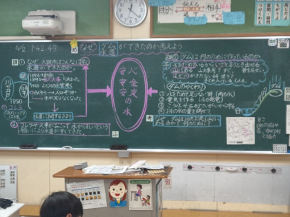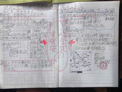 社会科の時間は、大阪市の水道のあゆみや、ダムの役割について教科書の資料をもとに調べてノートにまとめました。