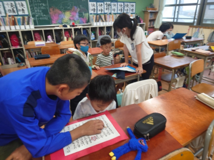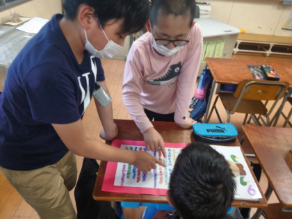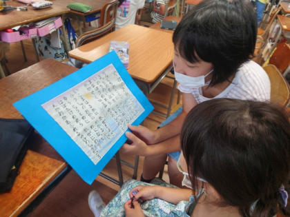 教室と多目的室に分かれて、6年生が1年生に校歌を教えました。