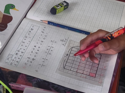 算数科の時間は、辺の長さが分数のときの面積の計算の学習をしています。