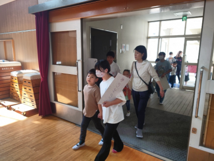6年生のリーダーが、1年生の手を引いて講堂に集合しています。