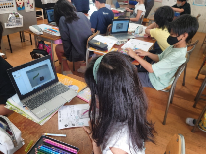 理科の時間は、パソコンの画面を見ながら、ヘチマとヒョウタンの苗を観察し、プリントに記録しました。