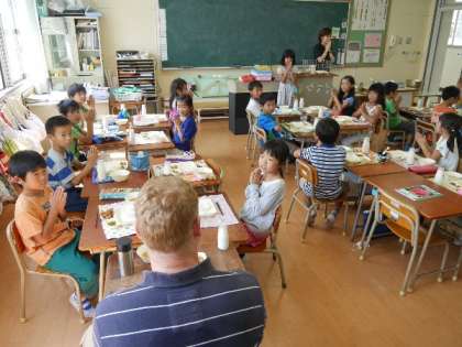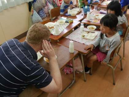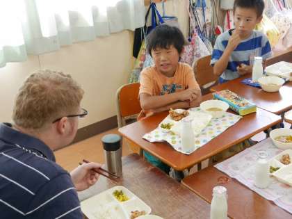 ひさしぶりに、中学校からC-NETの英語ネイティブのメイソン先生がきてくれました。今日は2年生で給食を一緒にいただきました。英語で「名前は?」ときかれて、少しドキドキしながら答えました。