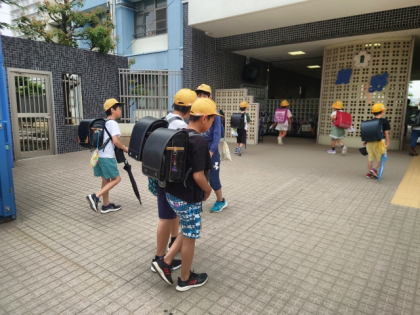 子どもたちが傘を持って登校してきました。