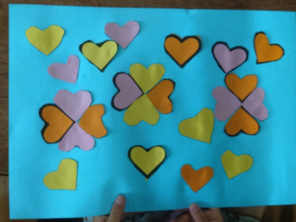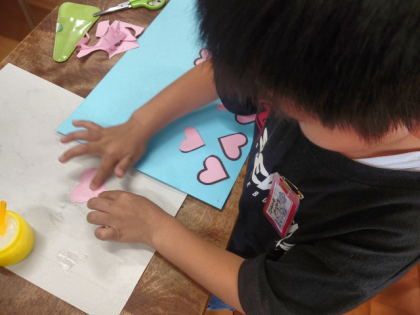 図工科の時間は、ハートマークを並べて模様をつくり、のりを使って画用紙に貼っていきました。