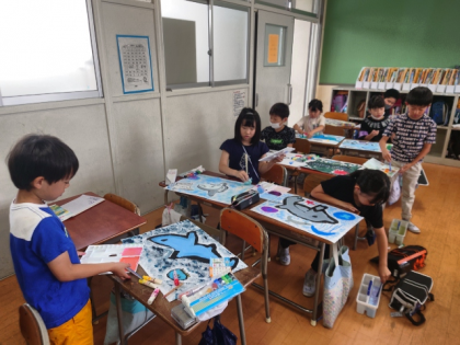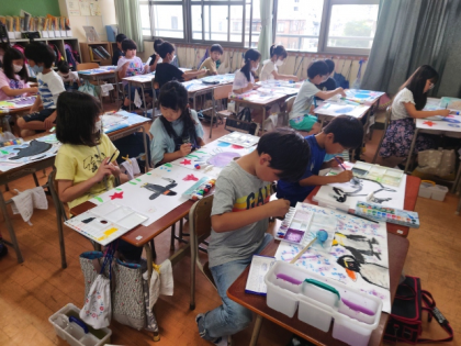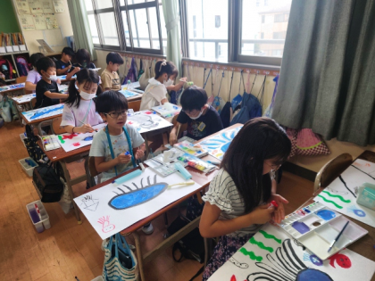 図工科の時間は、パスや絵の具を使って画用紙いっぱいに海の生き物を描きました。