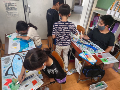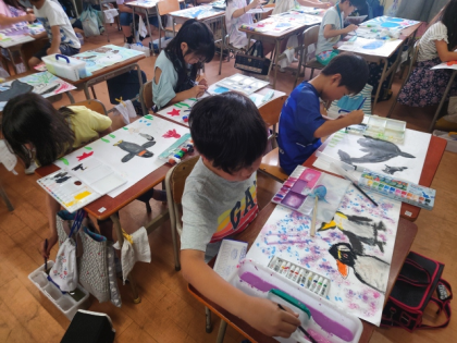 図工科の時間は、パスや絵の具を使って画用紙いっぱいに海の生き物を描きました。