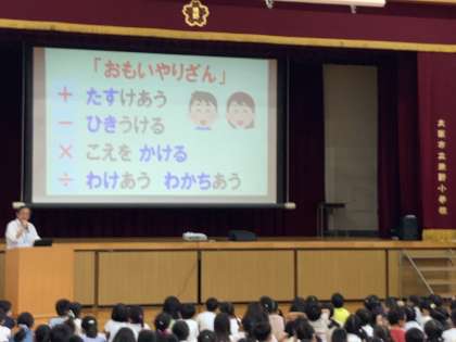 今日は、焼野小学校をすてきな学校にするための『あ、い、う、え、お』の『お』、『おもいやり』のお話をしました。