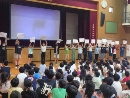 今朝の児童朝会は、全学年の子どもたちが講堂に集まって行いました。