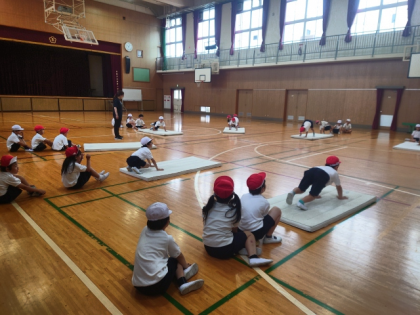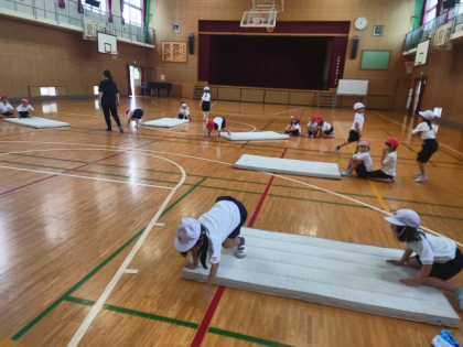 マット運動につながる基本的な動きとして、マットの上でくまさん歩きをしたり、かえるとびをしたりした後、一人一人前回りの練習をしました。