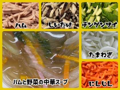 中華スープは、ハム・しいたけで旨みを出し、青みにチングンサイを使い彩りよく仕上げています。はるさめを使用し、ボリュームを出しています。