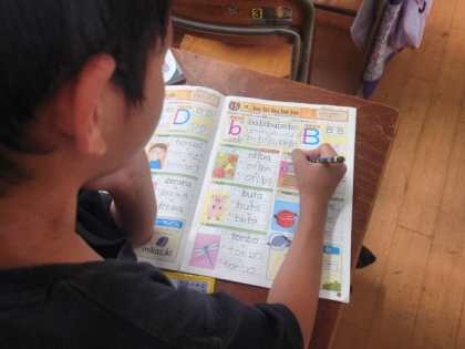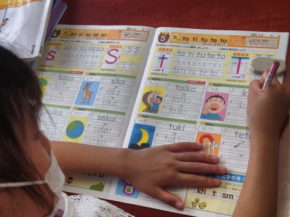 練習帳を使って、ローマ字「S」「T」の練習をしています。