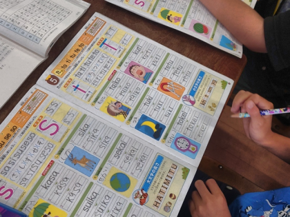 練習帳を使って、ローマ字「S」「T」の練習をしています。