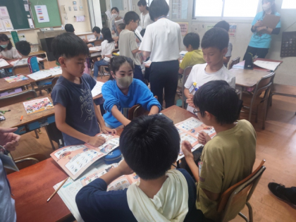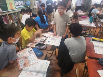 時間割が何曜日のものか英語の表現を聞き取ったり、ペアで学びたい教科についてたずね合ったり、教科を表す言葉を「古今東西」風にグループで練習したりするなど、1時間の間にいろいろな活動があり、子どもたちにとって充実した学習になりました。