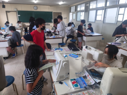家庭科の時間は、ミシンを使ってナップザックをつくります。