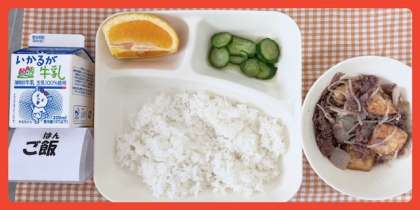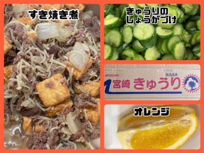 今日の献立は、すき焼き煮・きゅうりのしょうがづけ・オレンジ・ごはん・牛乳でした。