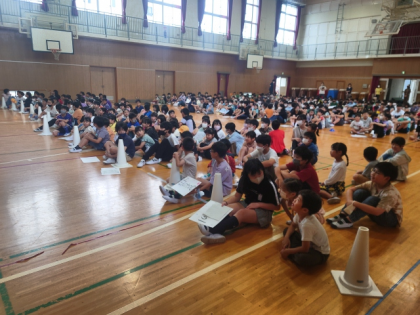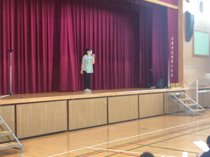 カーテンの裏に隠れている教職員の声を聞いて、誰の声かを当てるクイズです。