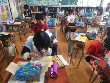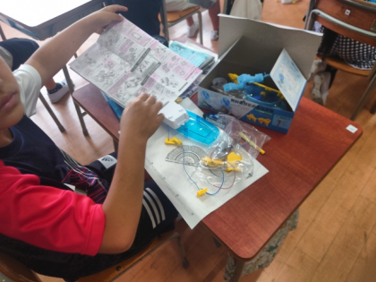 理科の時間は、実験教材の箱を開けて、電流について調べる実験をするための準備をしました。